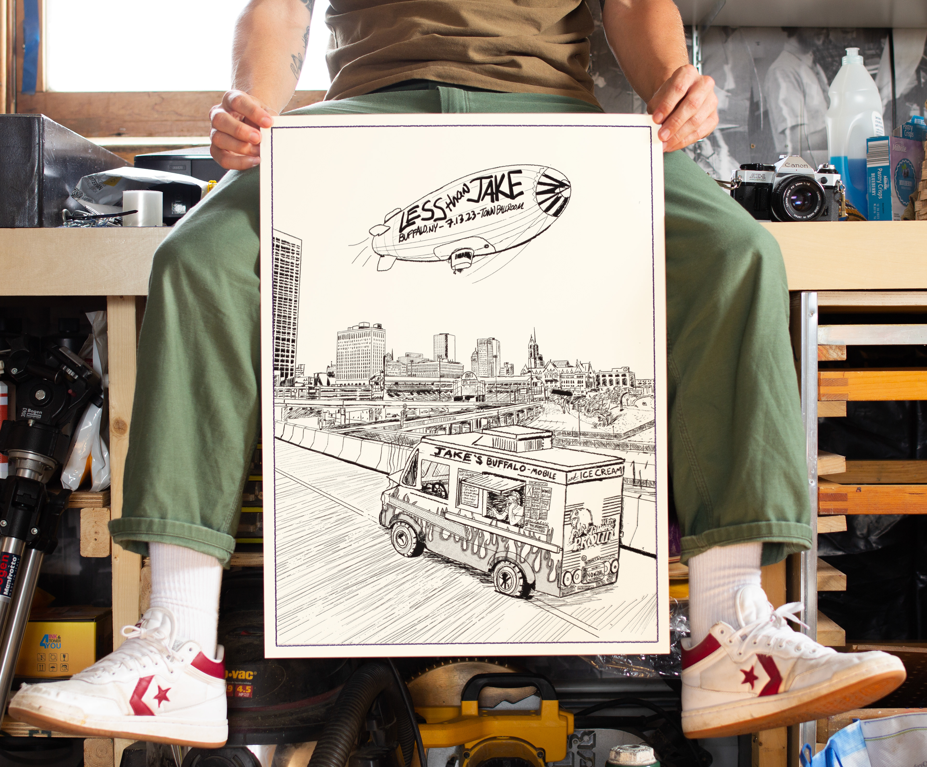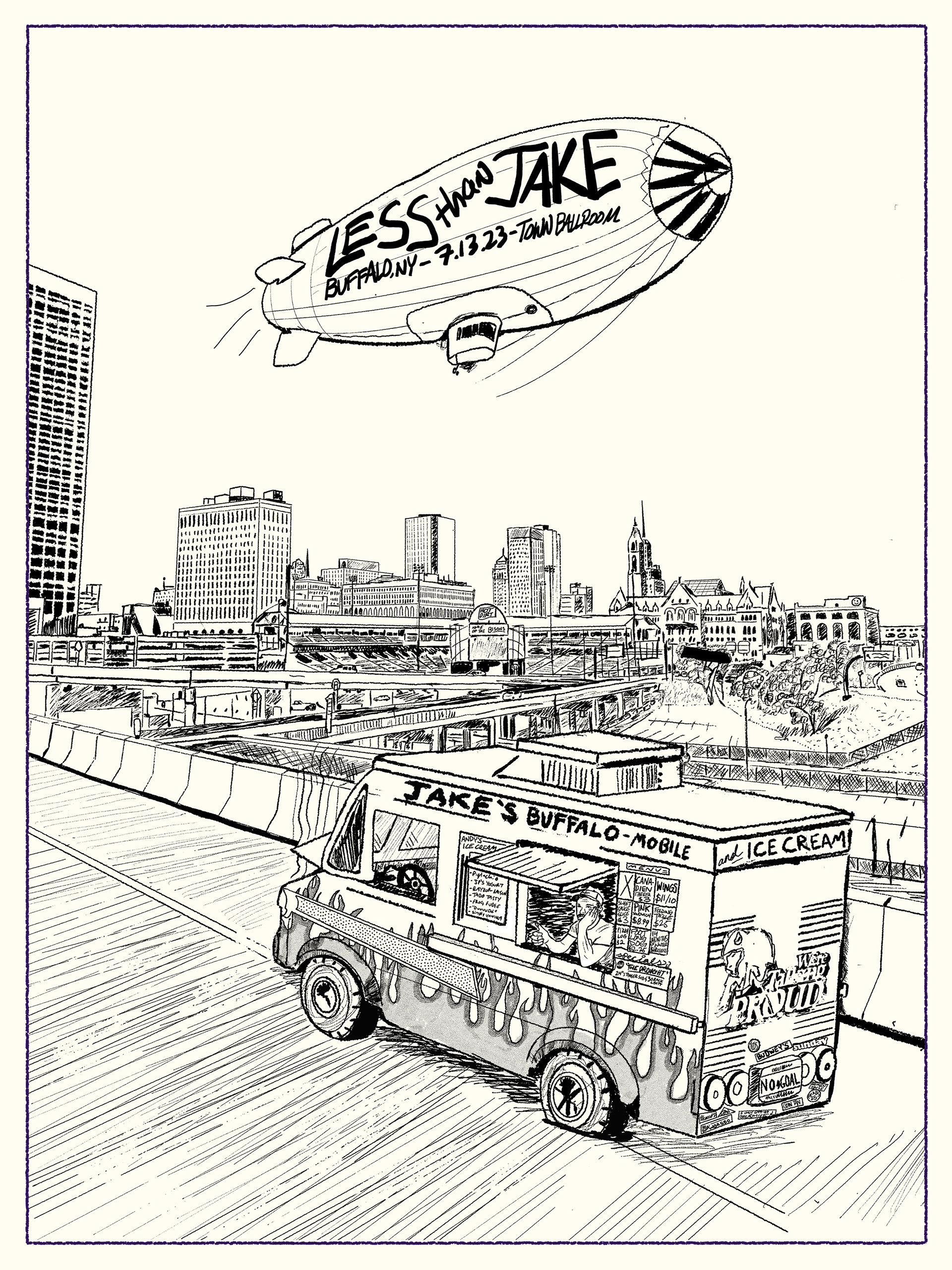 Illustrated poster for Less Than Jake's show at Buffalo's famed Town Ballroom. The goal was to do a cheap but striking illustration that captured the essence of Buffalo. One color print by Jesse Purcell at Repetitive Press.