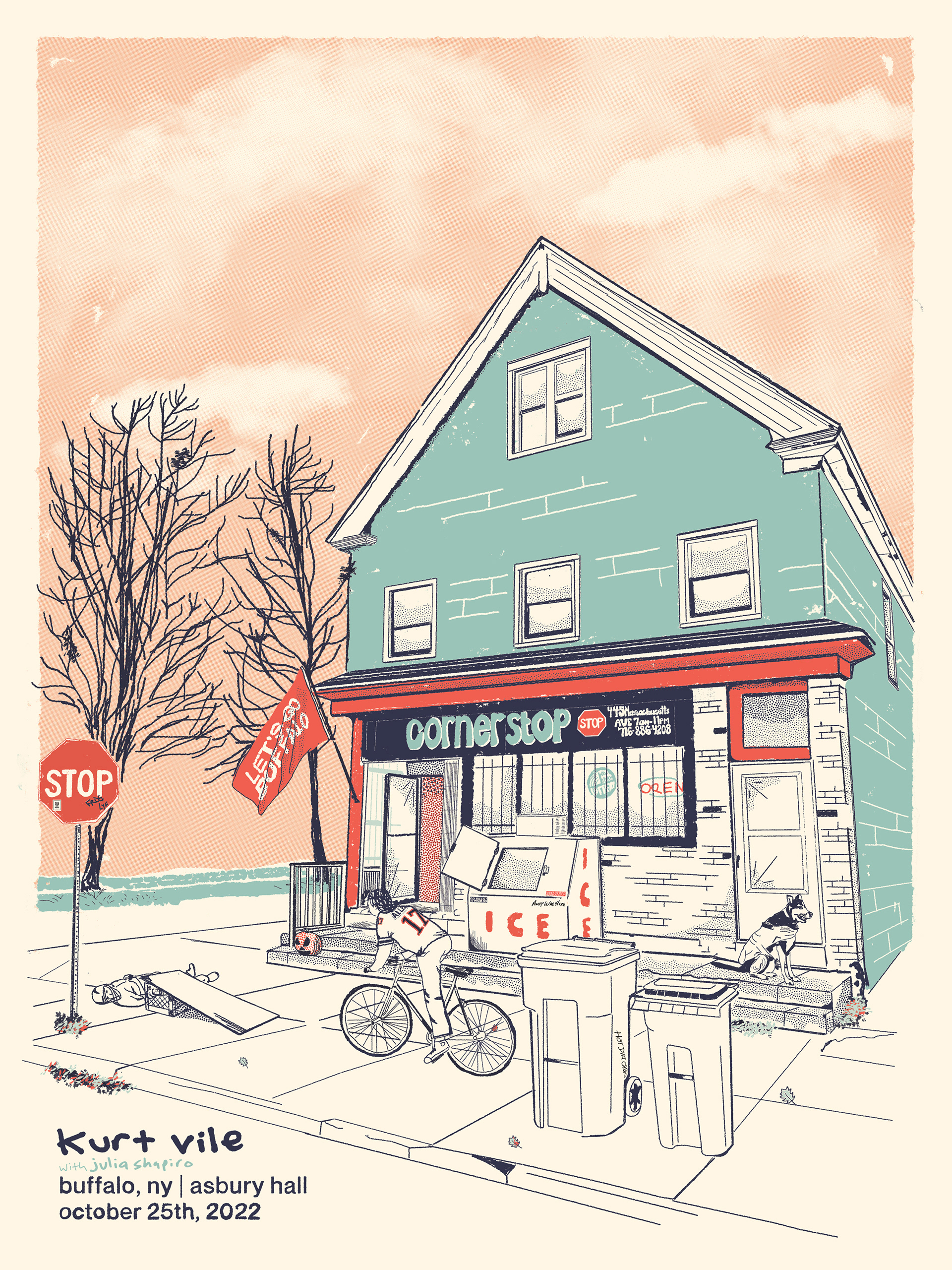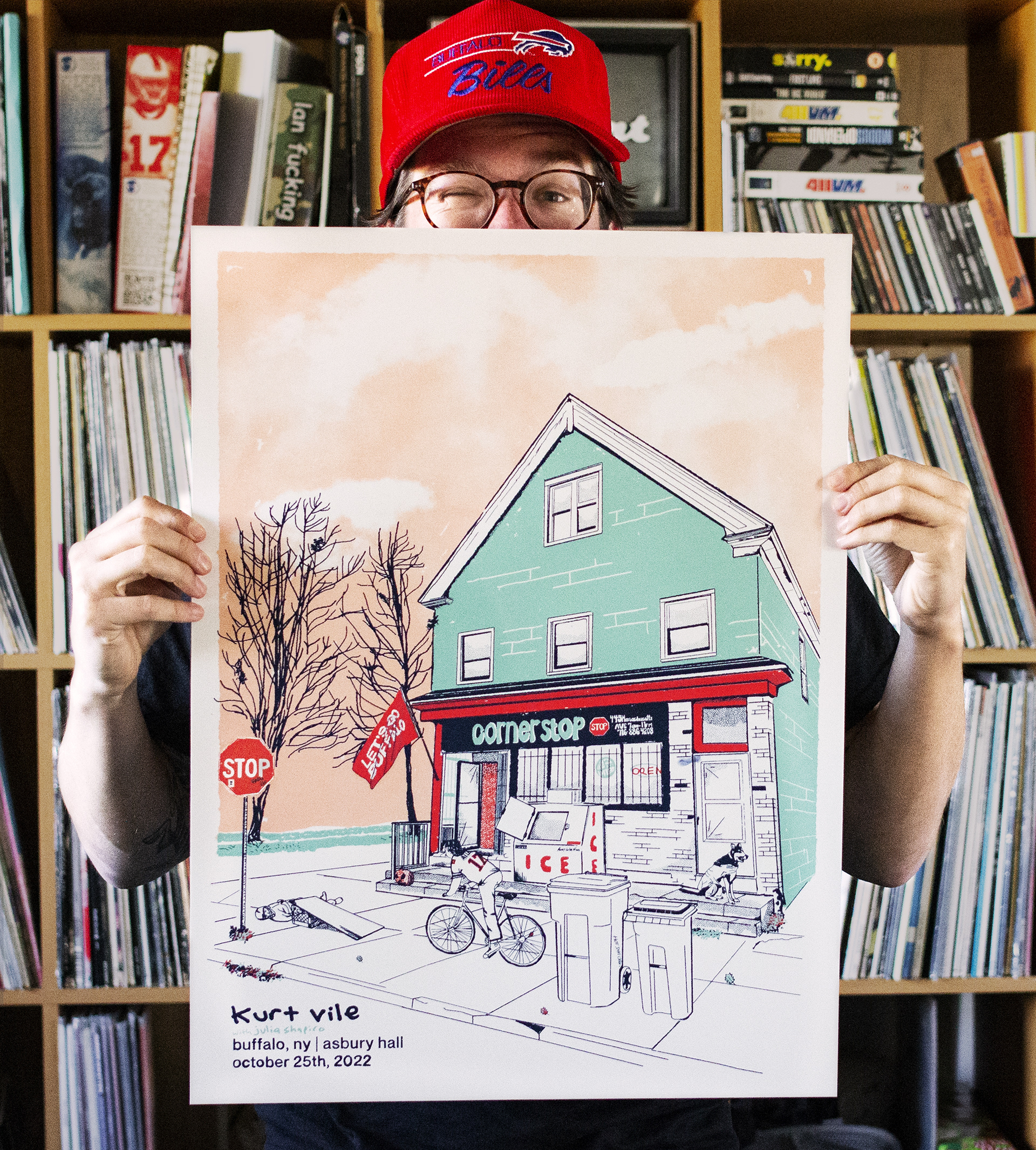 4 color illustrated poster for a Kurt Vile gig in Buffalo, NY. Printed by Kid Icarus in Toronto, Ontario.
