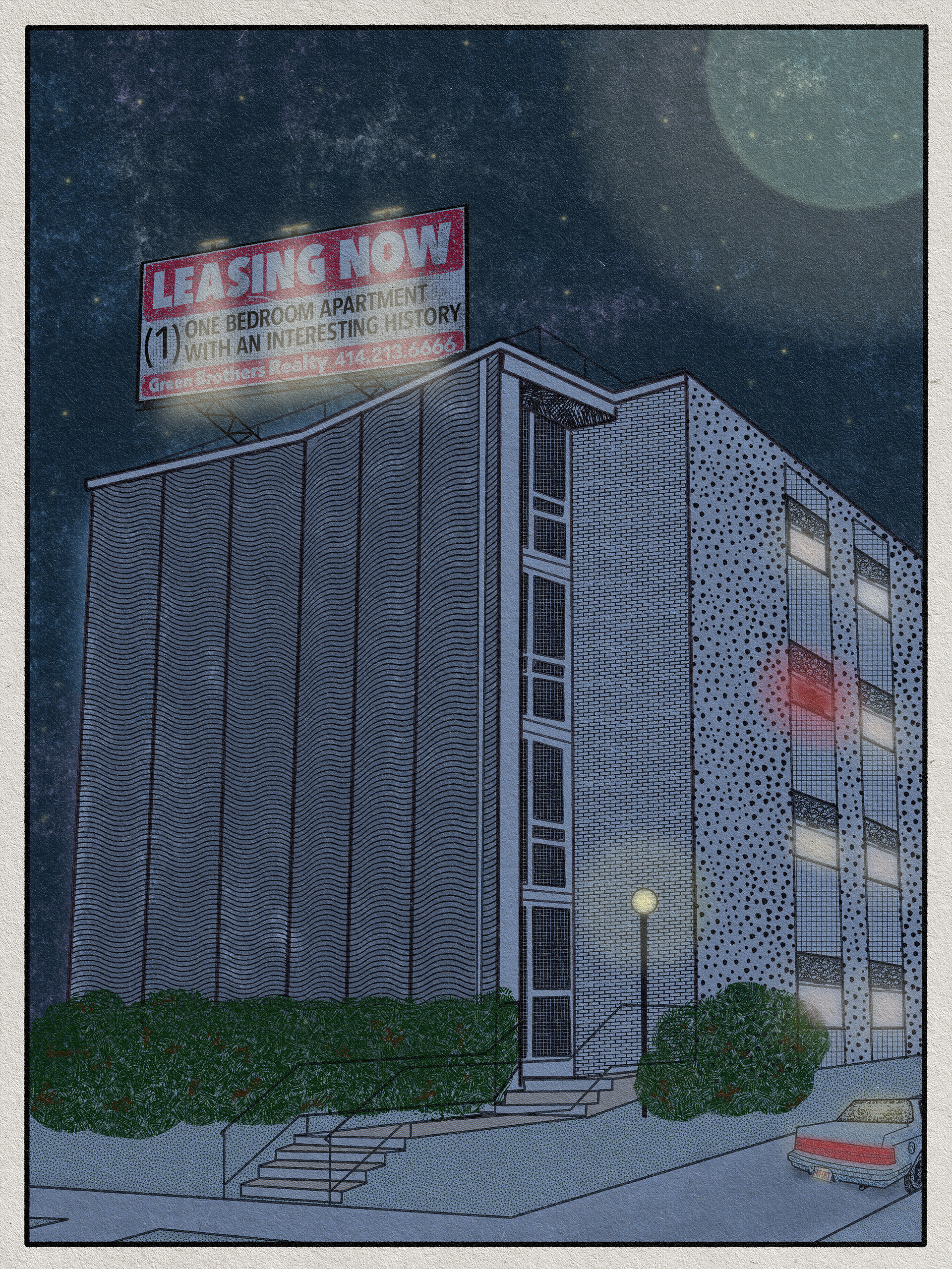 Poster made for well-known podacst, Last Podcast on the Left. The image was created as an insert for their forthcoming comic book, 'Last Comic Book on the Left'. The building is the one in which Jeffrey Dahmer...well, I think we know what he did.
