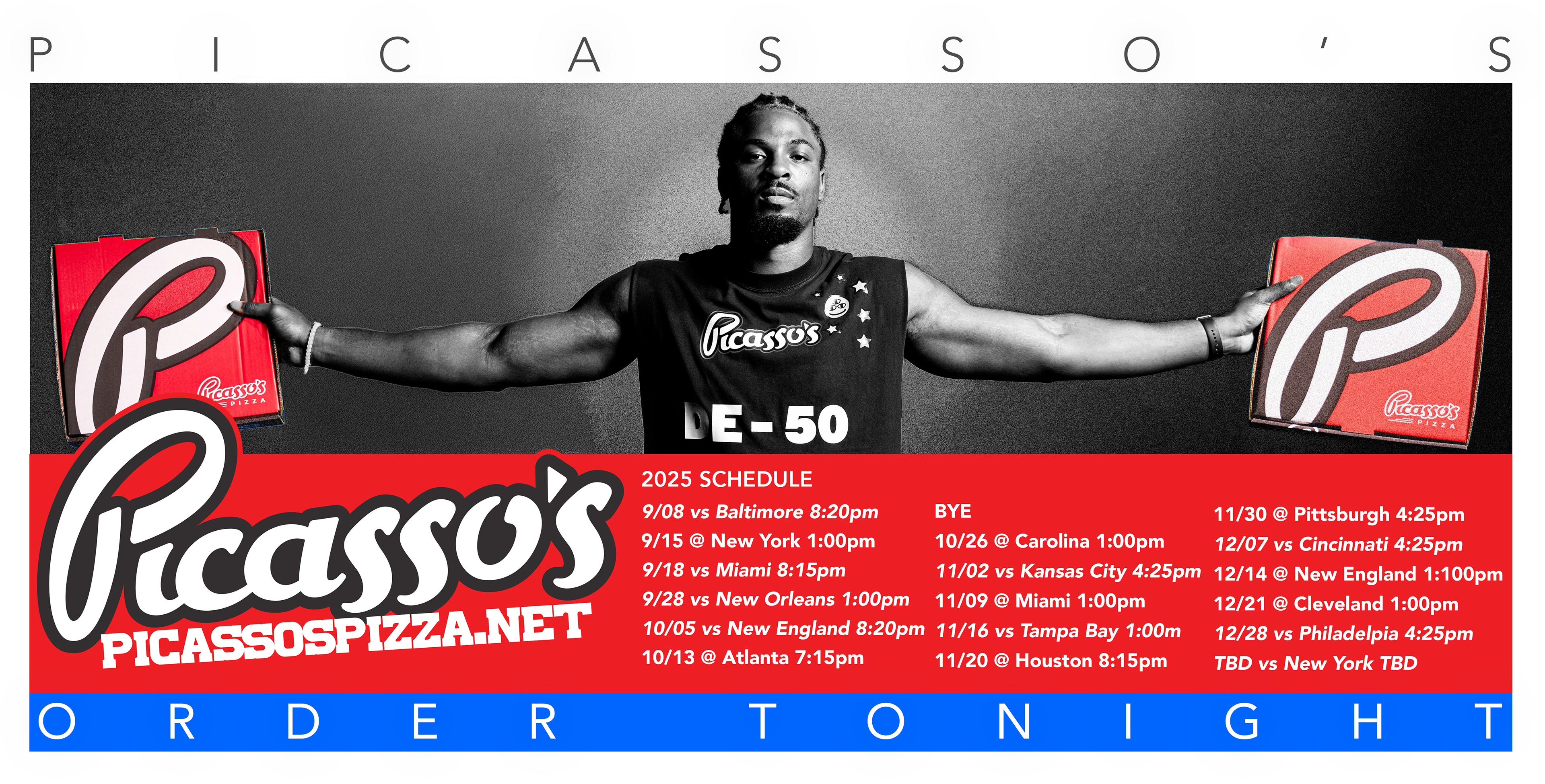 Direction and design for the 2025 'GAMEDAY READY' campaign for Picasso's Pizza. We did a custom photo and video shoot featuring 3 prominent players from the Buffalo Bills. These assets were deployed across multiple outlets, including 04 and 15 second spots for broadcast, social media, OOH, print ads, radio, etc. Very expansive campaign with a plethora of assets created between September 2025 and January 2026.