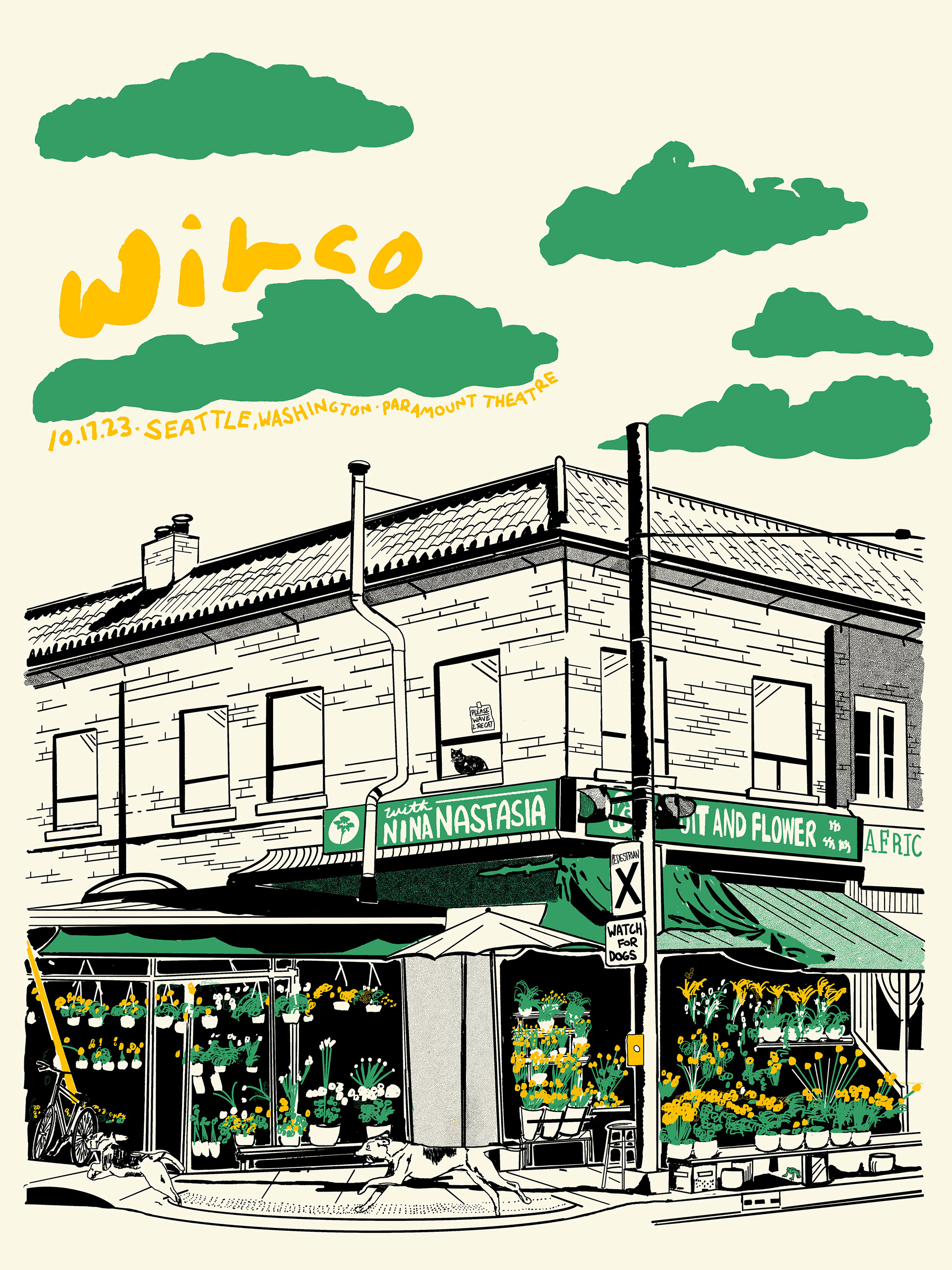 Another poster for the mighty Wilco, this time in Seattle, Washington. 3 colors on cream paper, showcasing a small corner flower shop, and some local dogs out front. Printed by Upright Press in Chicago.