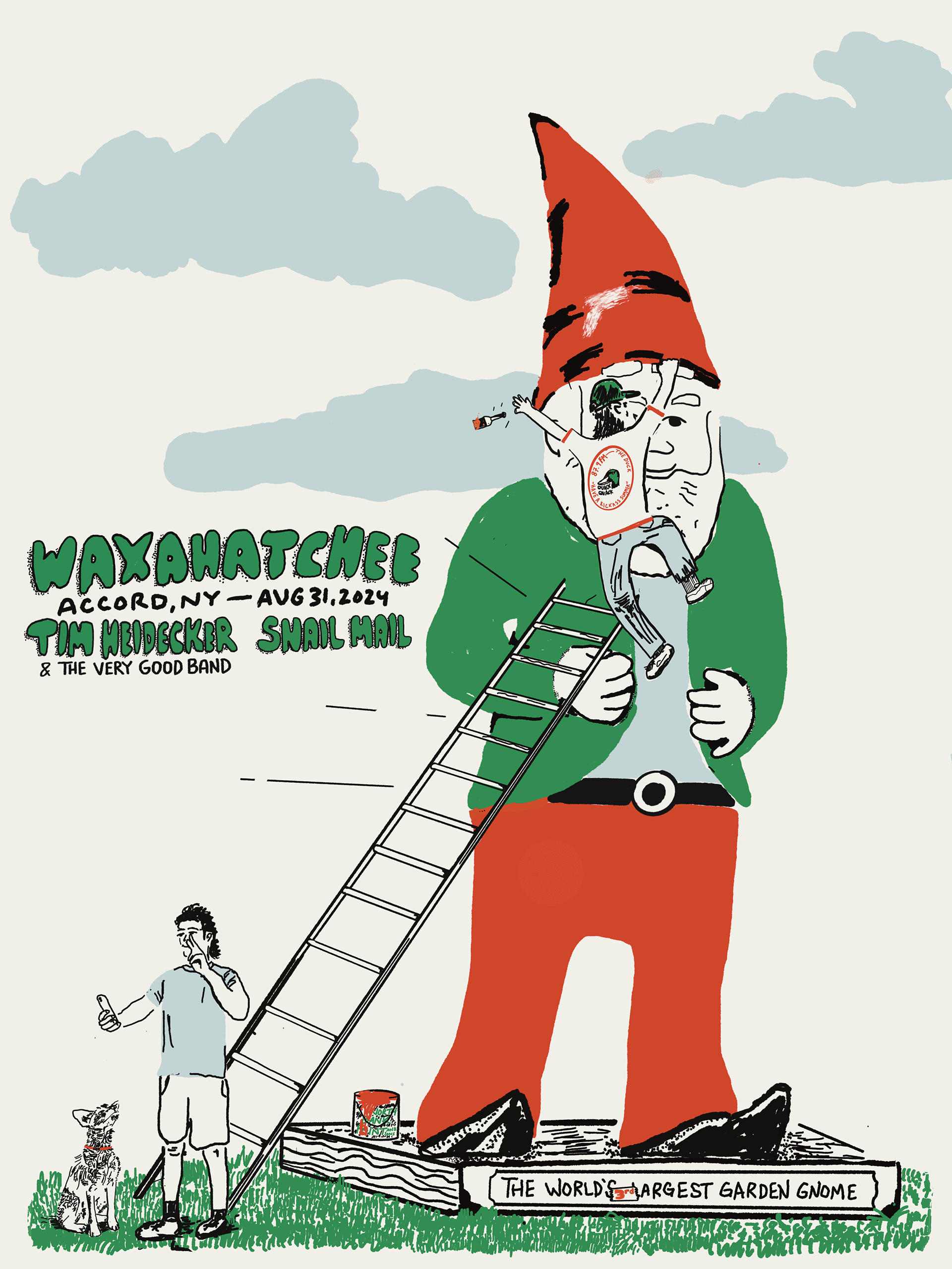 Gig poster for the great Katie Crutchfield,aka 'Waxahatchee'. Right outside the town of Accord, NY, there is a giant gnome statue that at once was the largest in the U.S. It isn't anymore, but still..that's a big gnome.